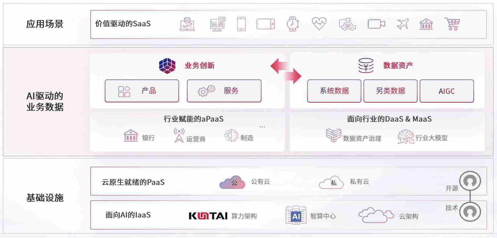 在基础设施层面,,,基于商业或开源的云原生就绪开发工具与技术组件(PaaS)和面向AI的底层公共基础设施资源(IaaS),,,将共同支撑企业完成数字化转型